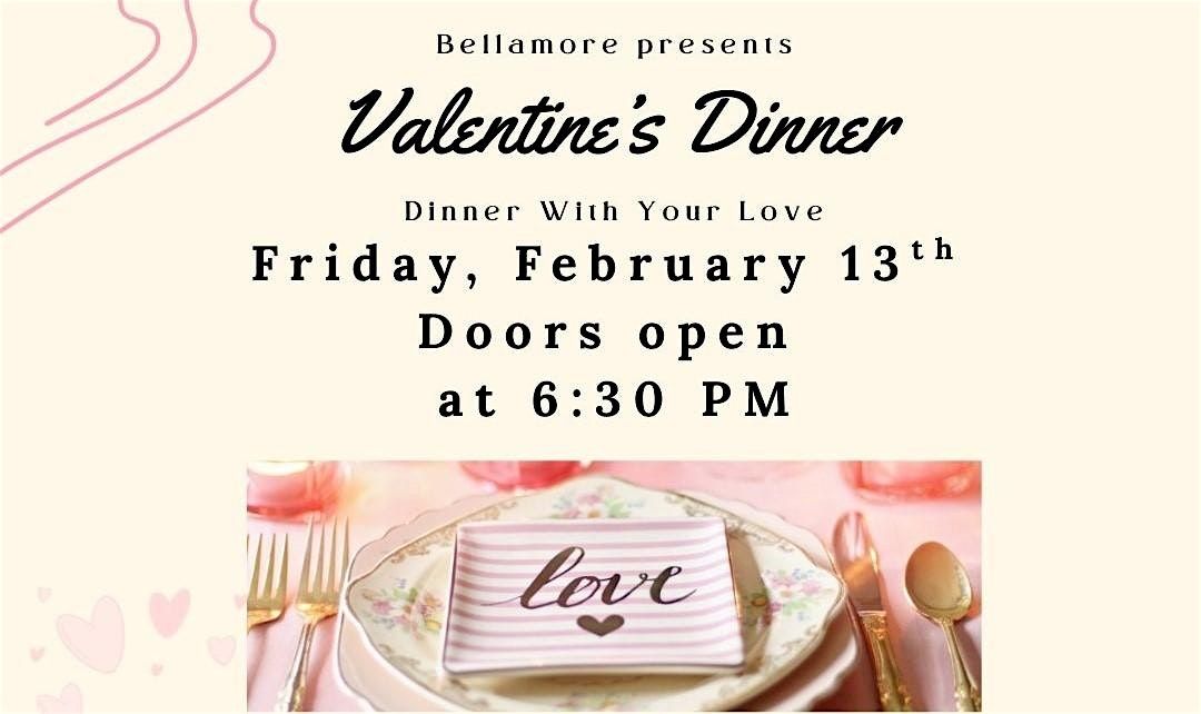 Welcome lovebirds! 💕 Join us for a romantic Valentine's Dinner at Bellamore on February 13, 2026 at 6:30 PM. Get ready for an enchanting evening filled with delicious food, delightful ambiance, and great music. Don't miss this chance to create unforgettable memories with your special someone. See you there!