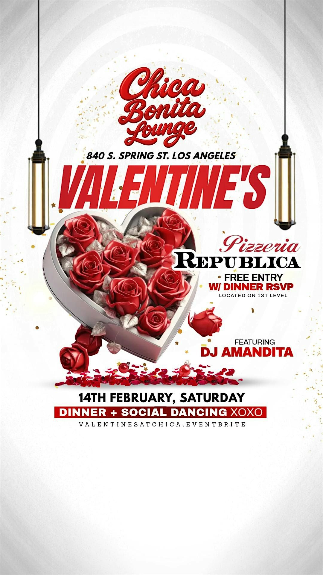 Get ready for a fun night out at Chica Bonita Lounge LGBTQ+! Join us for a Valentines Dinner followed by an epic Social Dance Party. Whether you're looking to mingle, dance, or just enjoy good vibes and great company, this event's got you covered. Come celebrate love, friendship, and good times. Don't miss out on the best Valentines vibes in DTLA!