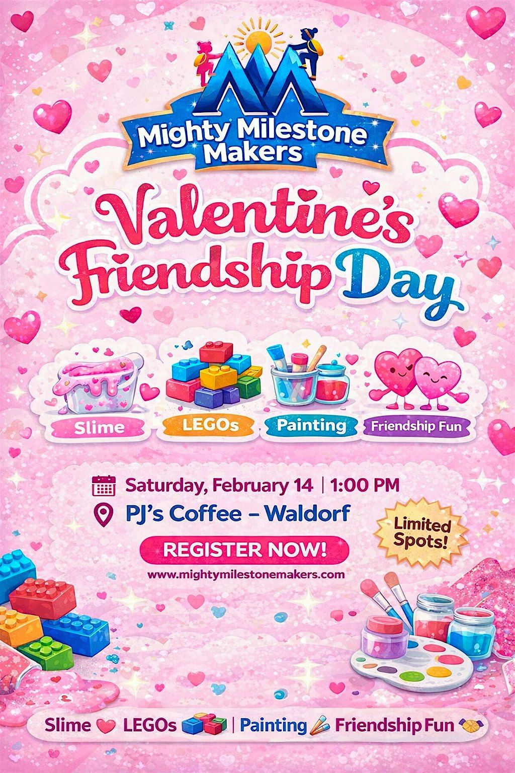 Join Mighty Milestone Makers for a fun-filled Valentine’s Day experience designed to help children connect, create, and build friendships in a warm, welcoming environment.