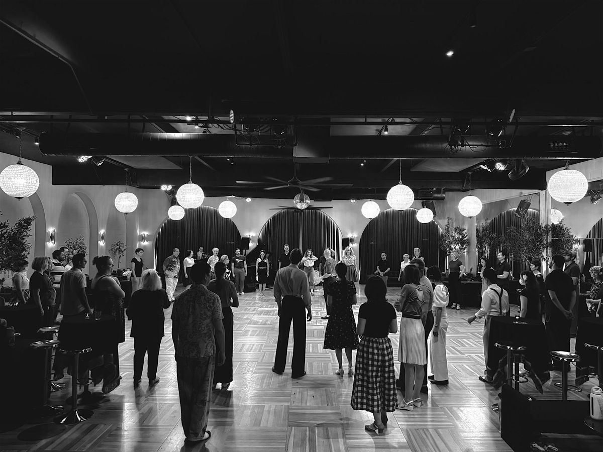 After the class, enjoy the full charm of our dance hall with a live swing band from 9:00 PM to midnight. Listen, mingle, or dance the night away — the space is yours to enjoy however you like. Motivo LA’s warm, art-deco atmosphere creates the perfect backdrop for a memorable night out.
