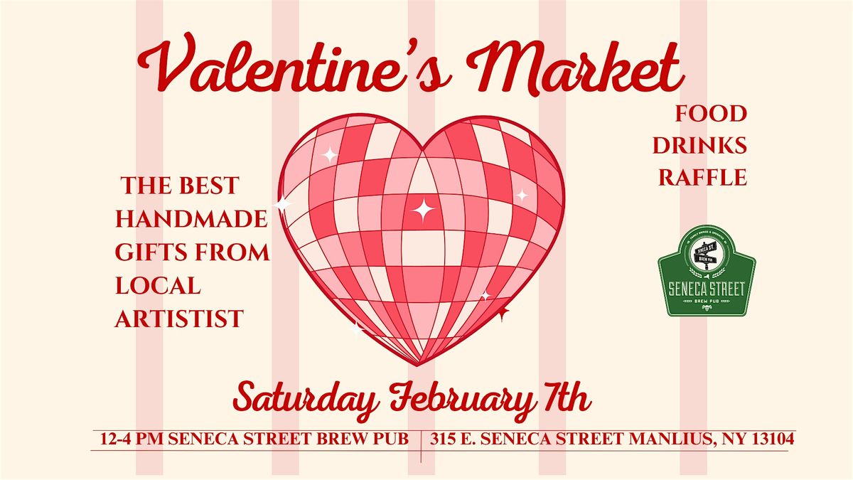 Join us on Saturday, February 7th from 12-4pm for our annual Valentine’s Market at Seneca Street Brew Pub! Shop a wide selection of unique, one-of-a-kind Valentine’s Day gifts handmade by the best local artists in Syracuse, while enjoying Seneca Street craft beers, craft Valentine’s Day cocktails, Hot Cocoa Bar and NYS wine & spirits! This family-friendly event is FREE to attend, accessible to all, and free street and lot parking will be available. We can’t wait to see you there!