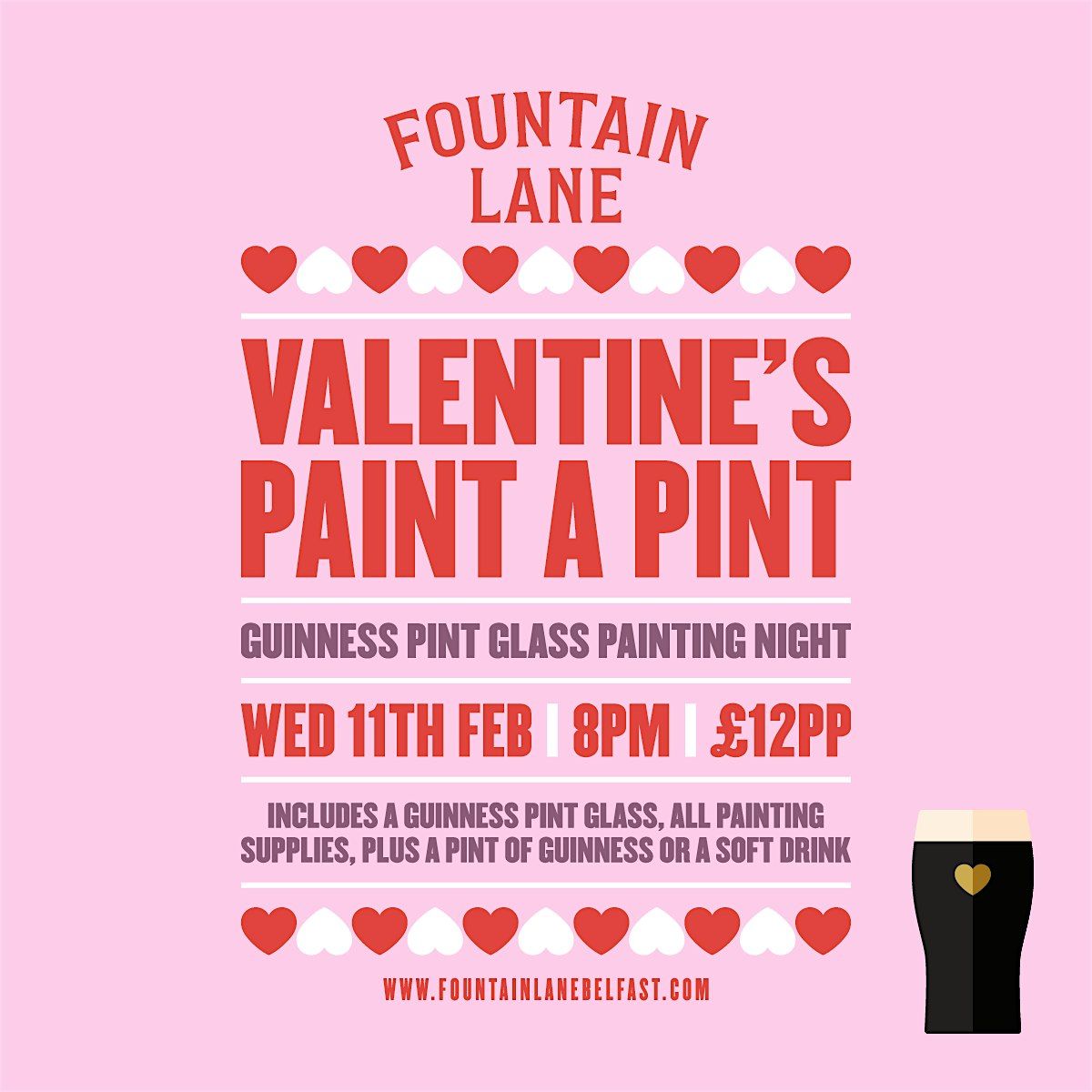 Looking for a cute & cosy Valentine's event? Join us for our Guinness Paint-A-Pint, ticket inlcuded pint of Guinness or soft drink! Enjou whilst designing your own pint glass with a selection of paints - the perfect mid-week date for couples or friends on the lead up to V-day! 💕🍺