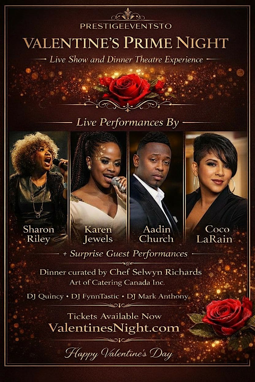 Valentine’s Prime Night (VPN) is an elevated Valentine’s Saturday experience at National Event Theatre – a chic, candlelit dinner and live music night for couples and classy singles. Doors open at 7:00 PM and a gourmet buffet dinner by Chef Selwyn Richards (Art of Catering) is served at 7:30 PM, featuring jerk chicken with caramelized mango, red snapper roulade, roast top sirloin, curry tofu channa, salads, sides and decadent desserts.