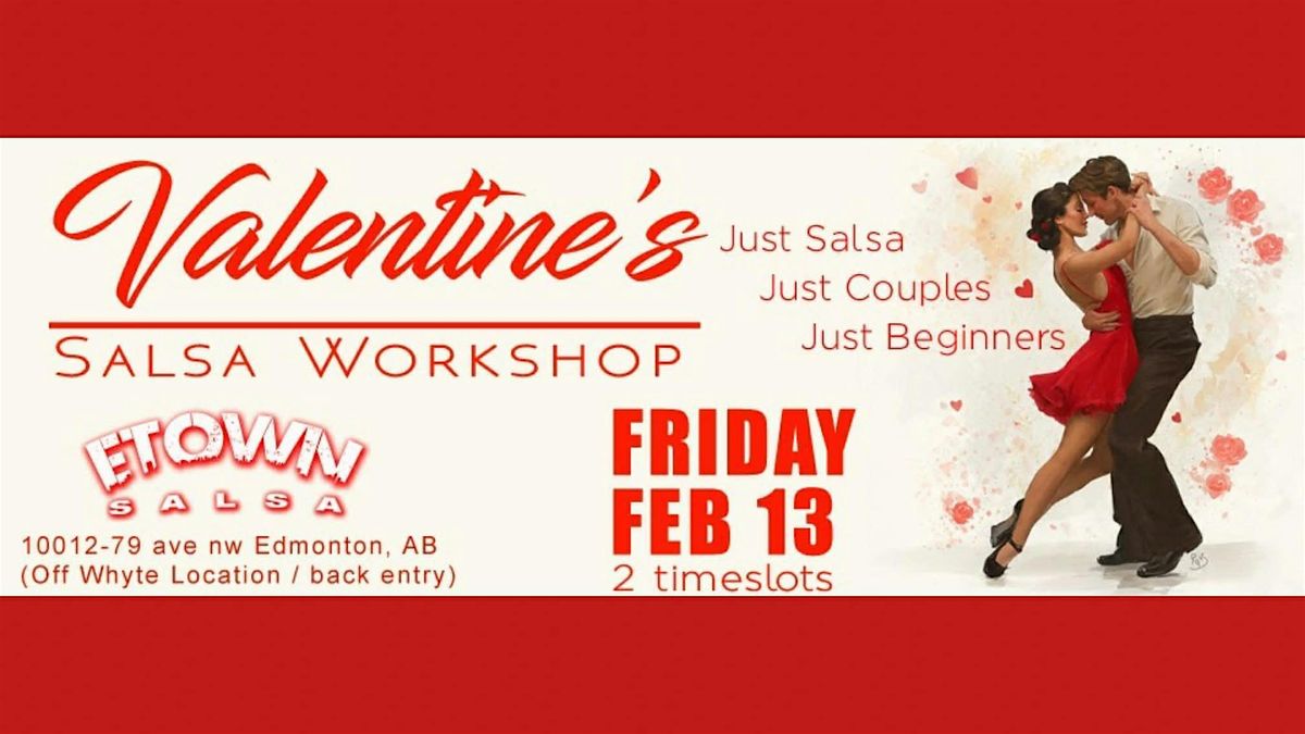 Feb 13 Valentine's Salsa Workshop If your wanting a more intimate time in a smaller space for your romantic dance night out or your occupied on Saturday Feb 14 and Friday is your option, then come dance for an hour of Salsa at a beginners level. Meant to be a fun, romantic night for you both, you will get to learn a few dance moves and put them to practice with your partner. We promise to make them very easy and fun! We have 2 timeslots available on FRIDAY but these will not last long as we only have space for 7 couples per workshop. FRIDAY FEBRUARY 13 6pm or 7:15pm times available REGISTER FOR EITHER 6 or 7:15pm