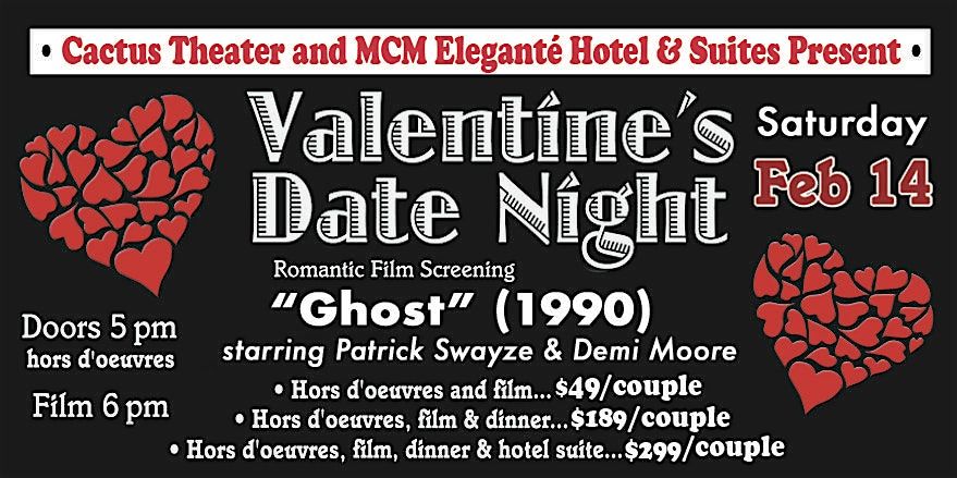 • $299 / couple for hors d'oeuvres, the movie and a Valentine’s Day Steak or Marry Me Chicken dinner selections at the hotel after the film; a king suite for overnight stay with after-dinner drink tickets and breakfast the next morning; (a single ticket is also available).