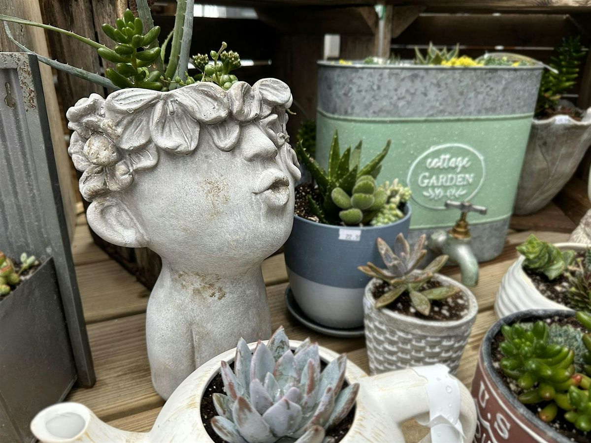 You will have the choice of either the 10" tall Kissing Planter (shown) or a 7" tall Small Kissing Planter. For either planter you will be able to choose up to 3 succulents from our selection.