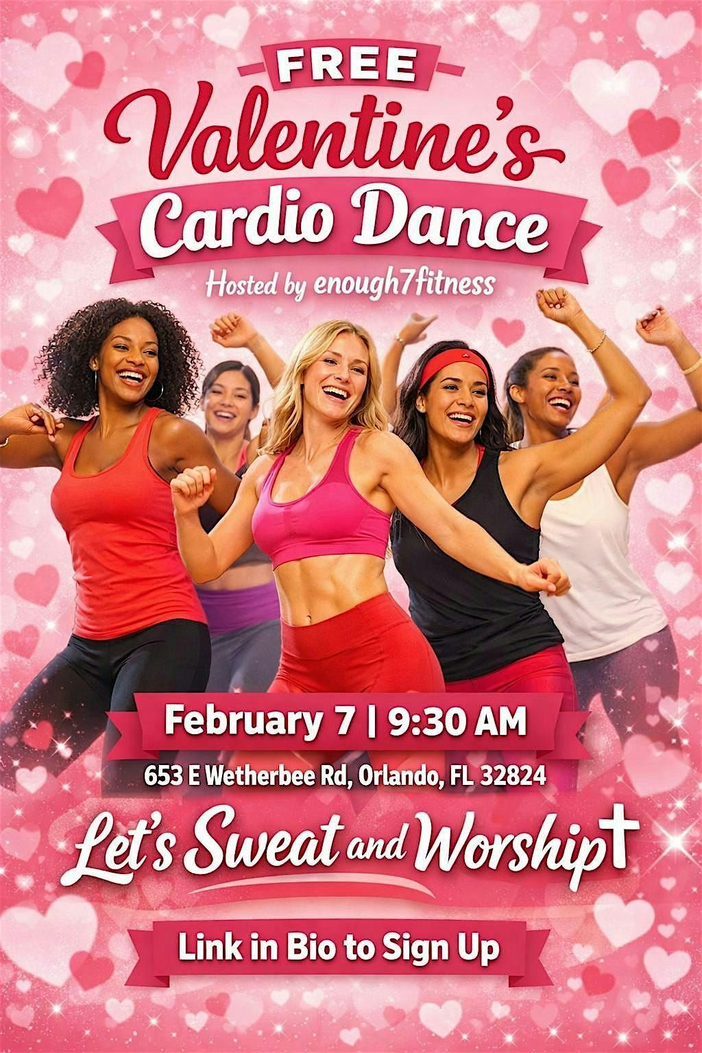 Join us for a VALENTINES THEMED CARDIO DANCE CLASS at VIVA Church on February 7, 2026 at 9:30 AM (Eastern Time)! Get ready to dance your heart out and feel the love in the air. No dance experience needed, just come ready to move and have fun! Don't miss out on this special event to celebrate love and fitness together. See you there and bring your girlfriends!