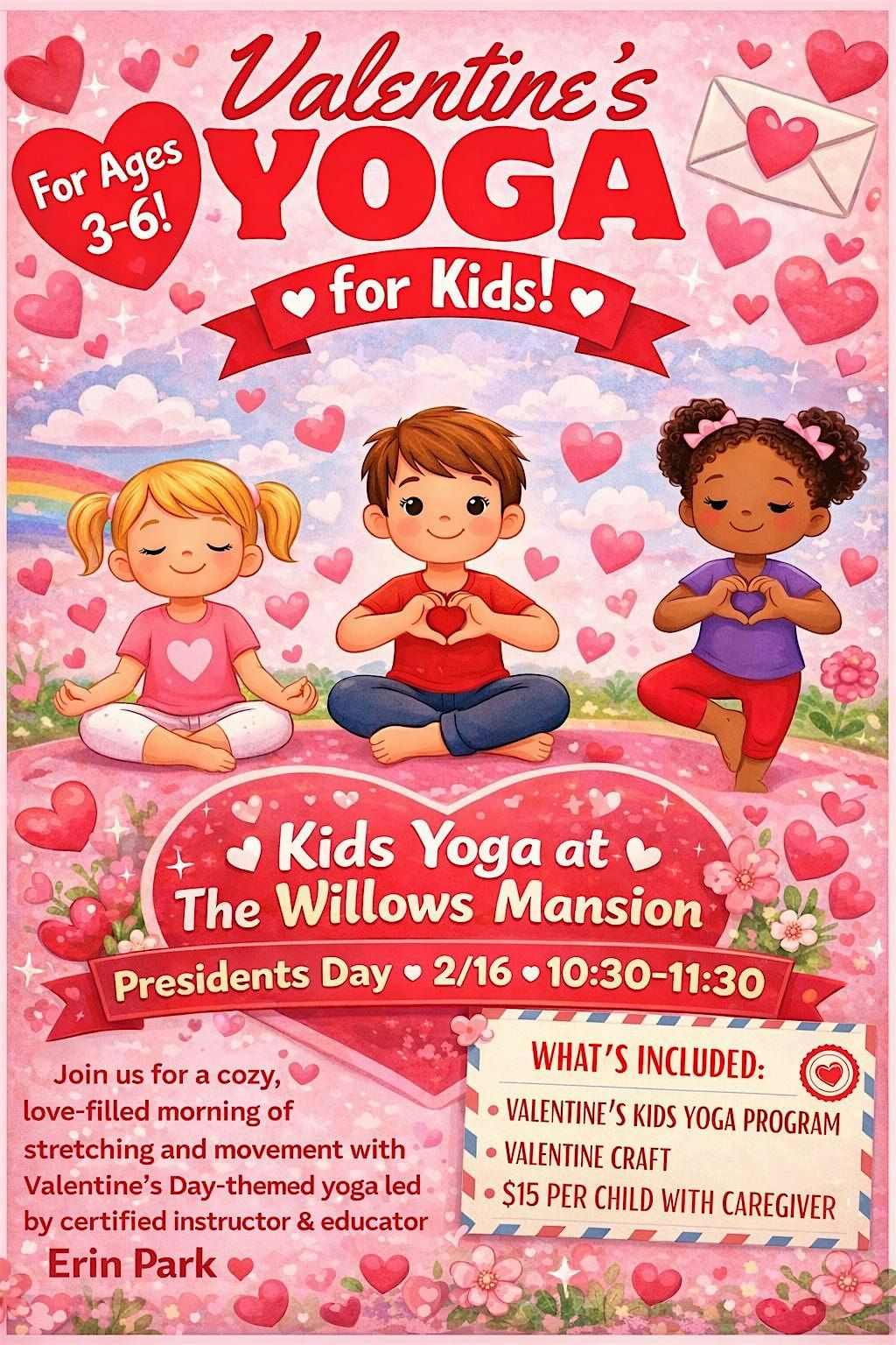 Join us at the Willows Mansion for a cozy, love-filled morning of stretching and movement with Valentine's Day yoga led by certified yoga instructor & Educator Erin Park! For children ages 3-6.