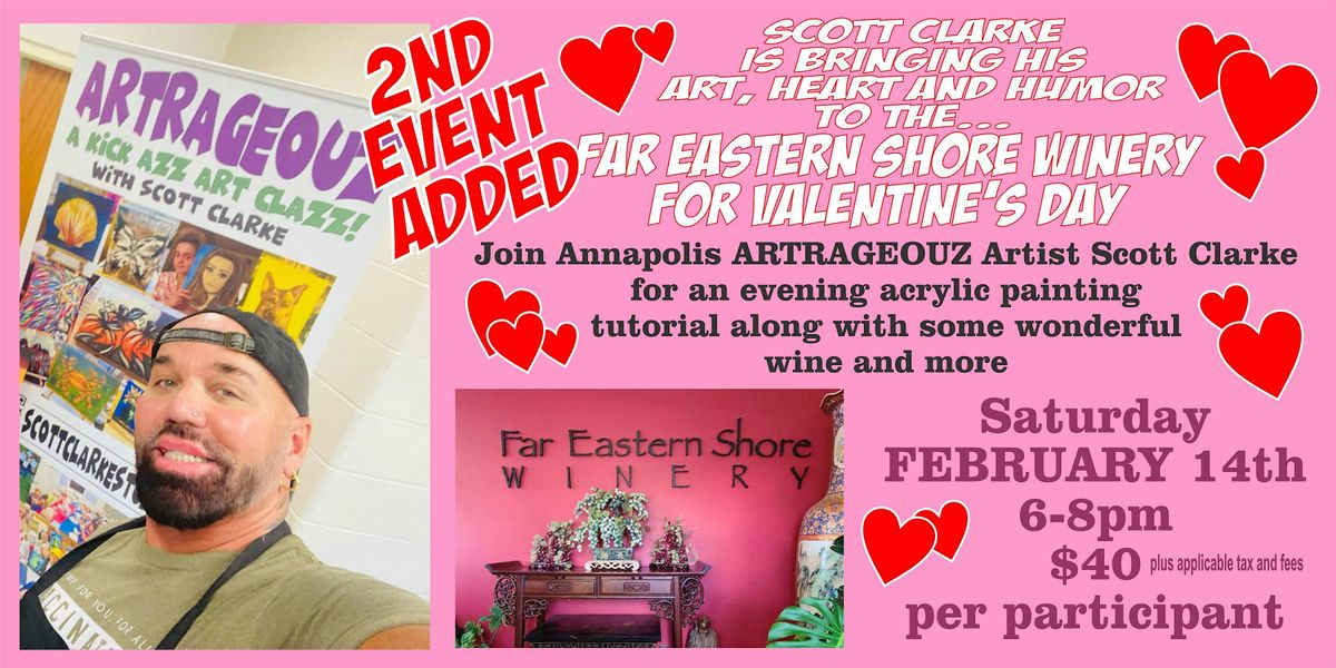 Relax and enjoy the lovely Far Eastern Shore Winery atmosphere while tasting delicious wines and creating a Valentine's Day themed acrylic painting(painting to be announced) with ARTRAGEOUZ comedic artist Scott Clarke
