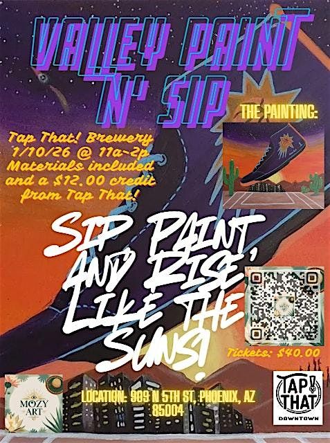 Get ready for a fun in-person night of creativity and relaxation at Valley Paint N' Sip. Whether you're a seasoned artist or just looking to try something new, this event is all about enjoying good vibes while you paint your own masterpiece. Bring your friends, sip on your favorite drinks, and let your imagination run wild. No stress, no pressure — just a chill atmosphere to unwind and make some art. See you there!