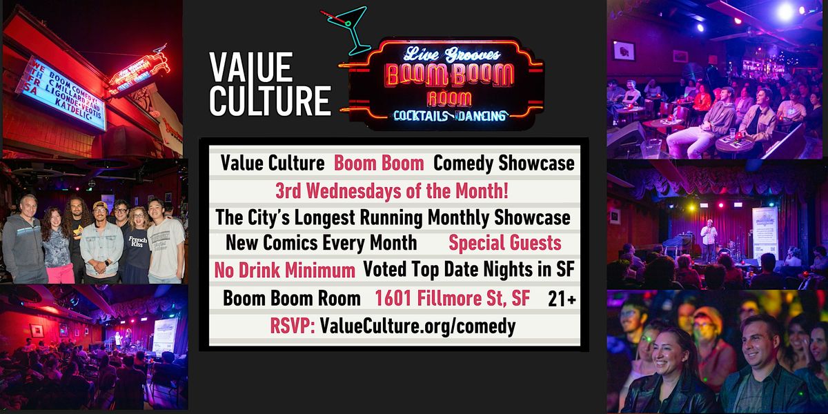 Join us for the always anticipated monthly and highly regarded Value Culture BOOM BOOM Comedy Showcase at the famous Boom Boom Room on Fillmore Street since 2023!
