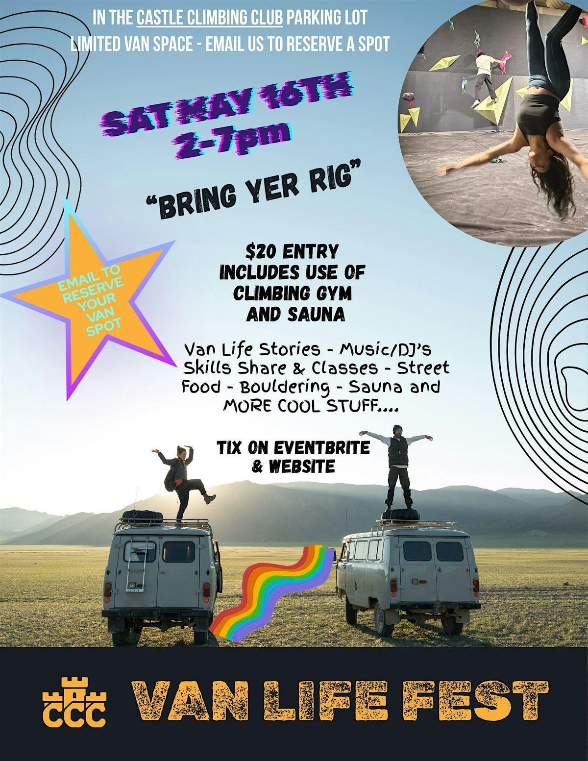 Bring yer rig! Swap van life stories, skills share & classes, bouldering, sauna, street food, music & DJ’s. Tix $20 includes access to the C