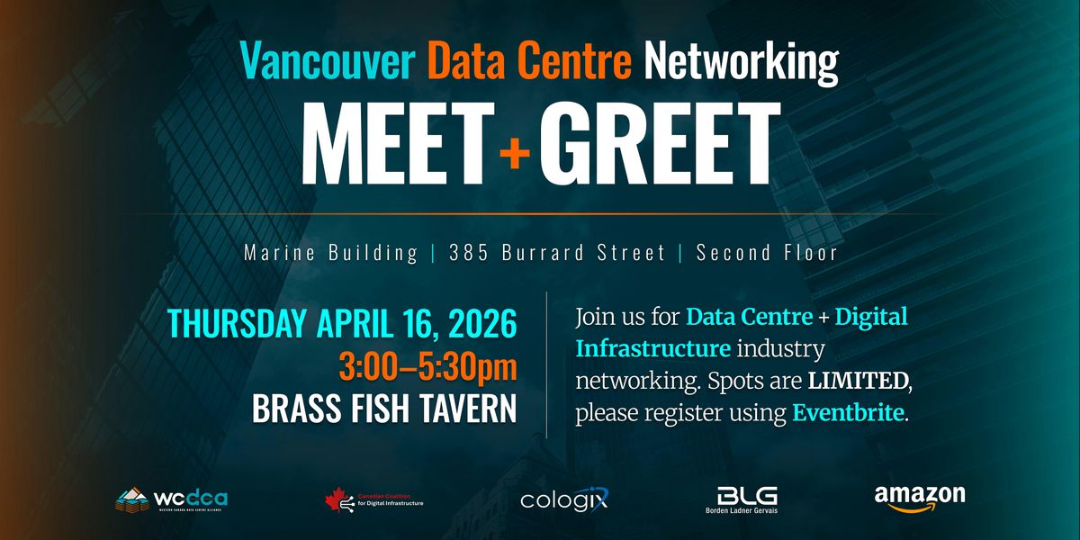 Join us in person for networking with fellow data centre industry in Vancouver! Whether you’re a seasoned expert or just curious, this is your chance to swap stories, share insights, and make some valuable connections in the heart of the city at a time when there's so much abuzz about the sector. Don’t miss out on the fun and connections – expand your network! Brought to you by Western Canada Data Centre Alliance, Canadian Coalition for Digital Infrastructure, Cologix, AWS, and BLG.