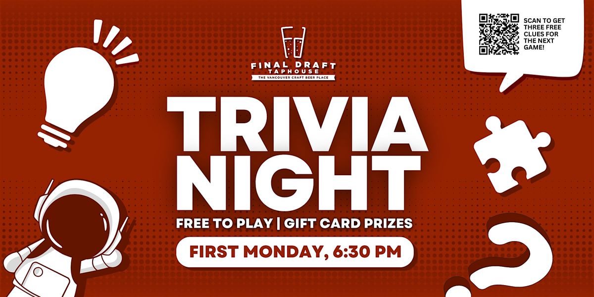 Join us for free live monthly trivia every first Monday at 6:30pm at Final Draft Taphouse in Vancouver, WA! Free to play, and top teams win gift card prizes!