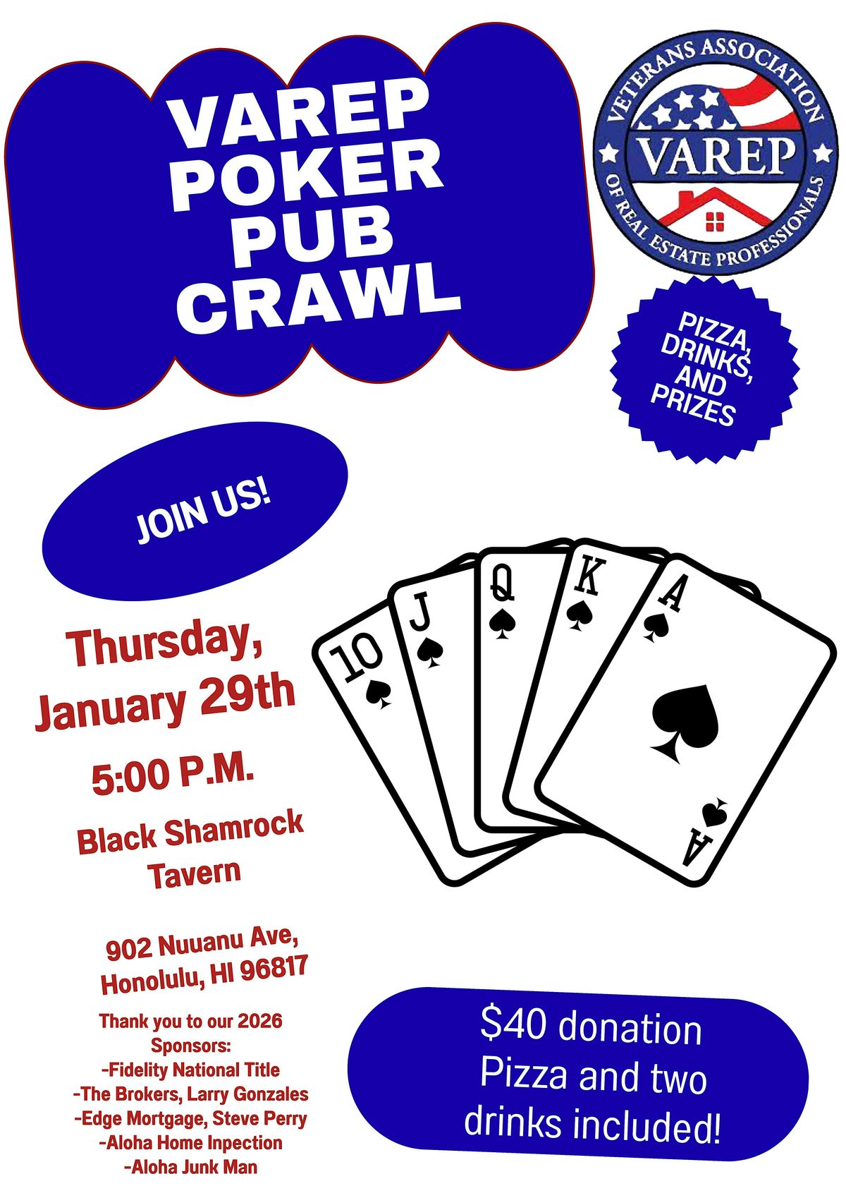 Join VAREP and crawl to five pubs and make the best poker hand you can! $40 donation gets you two drinks (soda, beer, or wine) and Pizza.About this Event