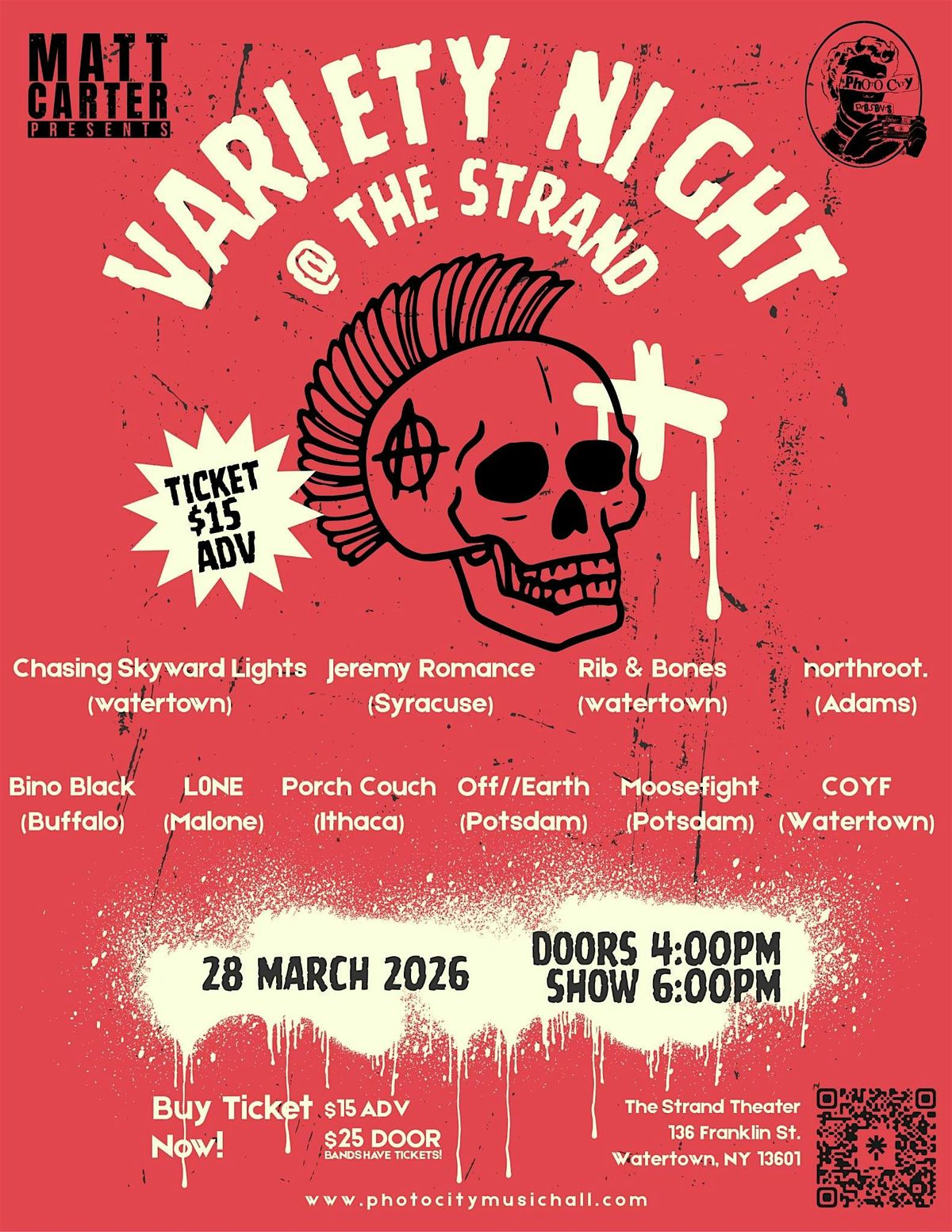 This event brings together metalcore, hardcore, indie, alternative, rap, and rock into one nightโhighlighting regional talent and Watertownโs local scene at ๐๐ฉ๐ฆ ๐๐ต๐ณ๐ข๐ฏ๐ฅ.