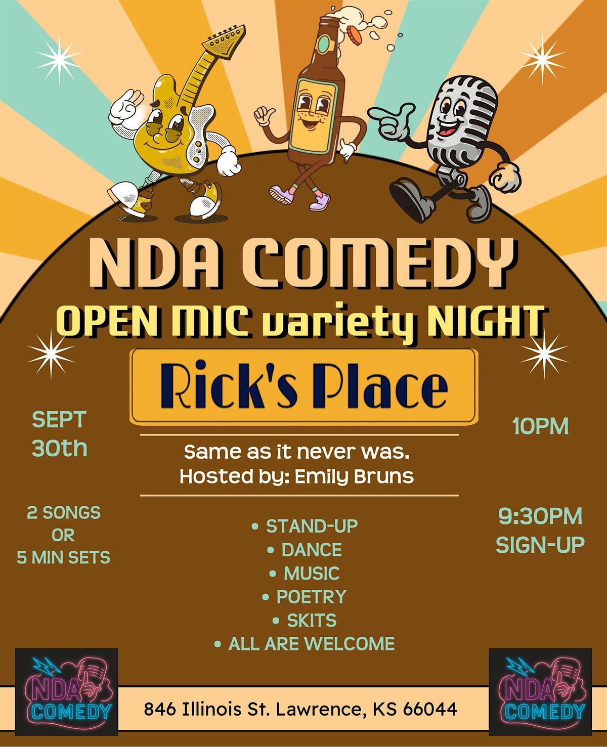 Got jokes? Songs? Poems? Rants? Weird talents? Bring ‘em all to the stage at Rick’s Place — ALL performance types welcome!