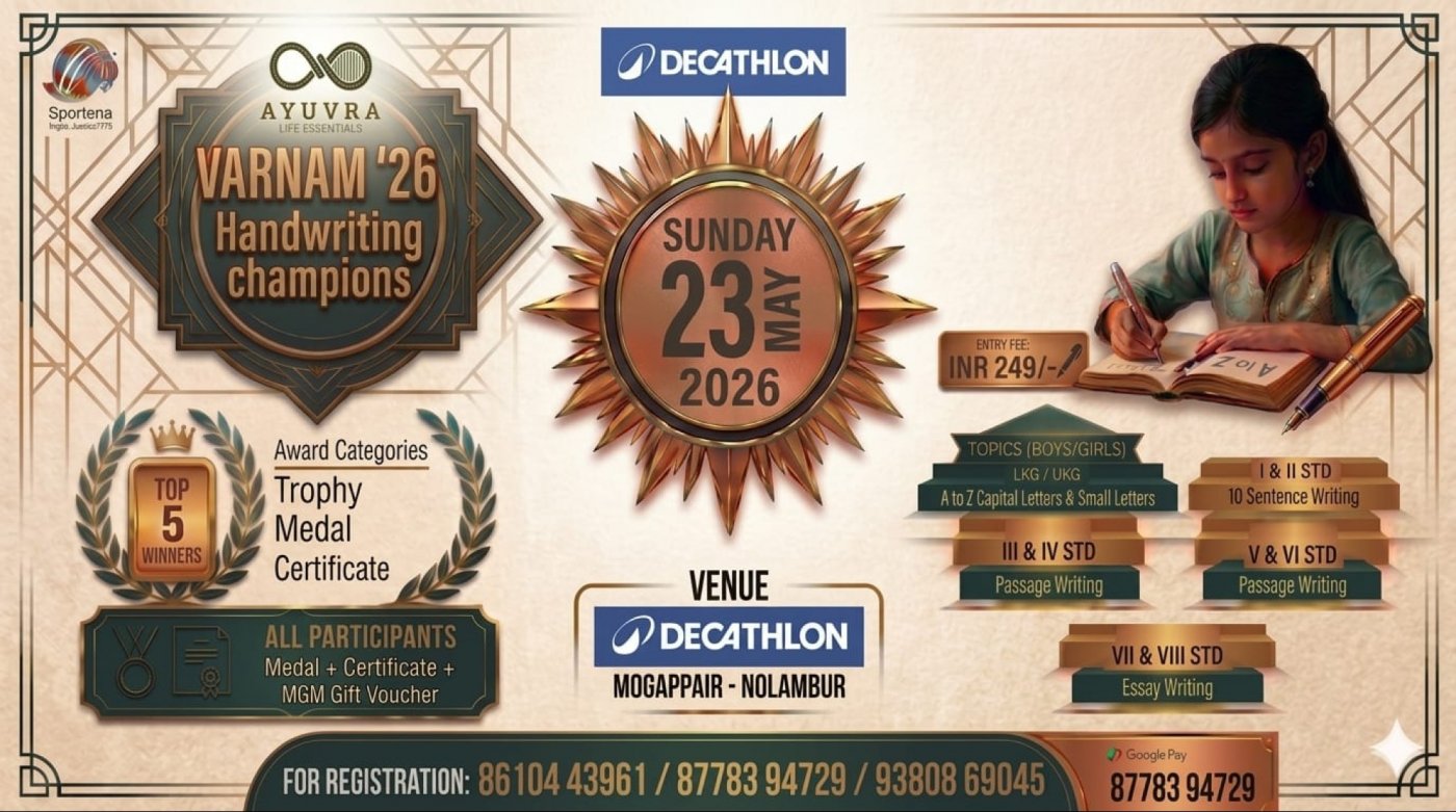 Decathlon Mogappair has partnered with Sportena Academy to meld the spirit of martial arts and handwriting skills - organizing a VARNAM 2026 - ART & COLORING & DRAWING | HANDWRITING CHAMPIONS on 23.05.2026 (SATURDAY) at Decathlon – Nolambur – Mogappair – Chennai.