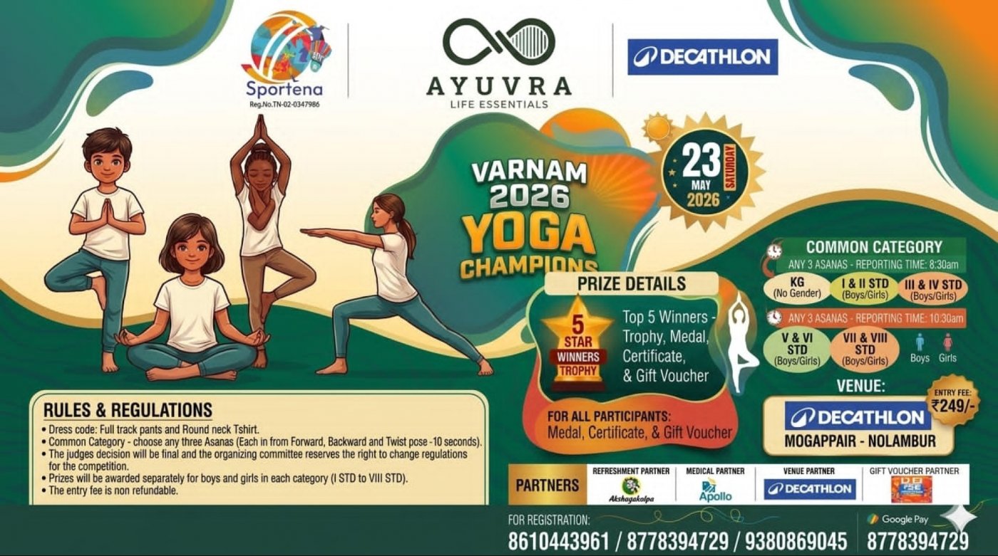 Decathlon Mogappair has partnered with Sportena Academy to meld the spirit of martial arts - organizing a VARNAM 2026 – YOGA CHAMPIONS on 23.05.2026 (SATURDAY) at Decathlon – Nolambur – Mogappair – Chennai.