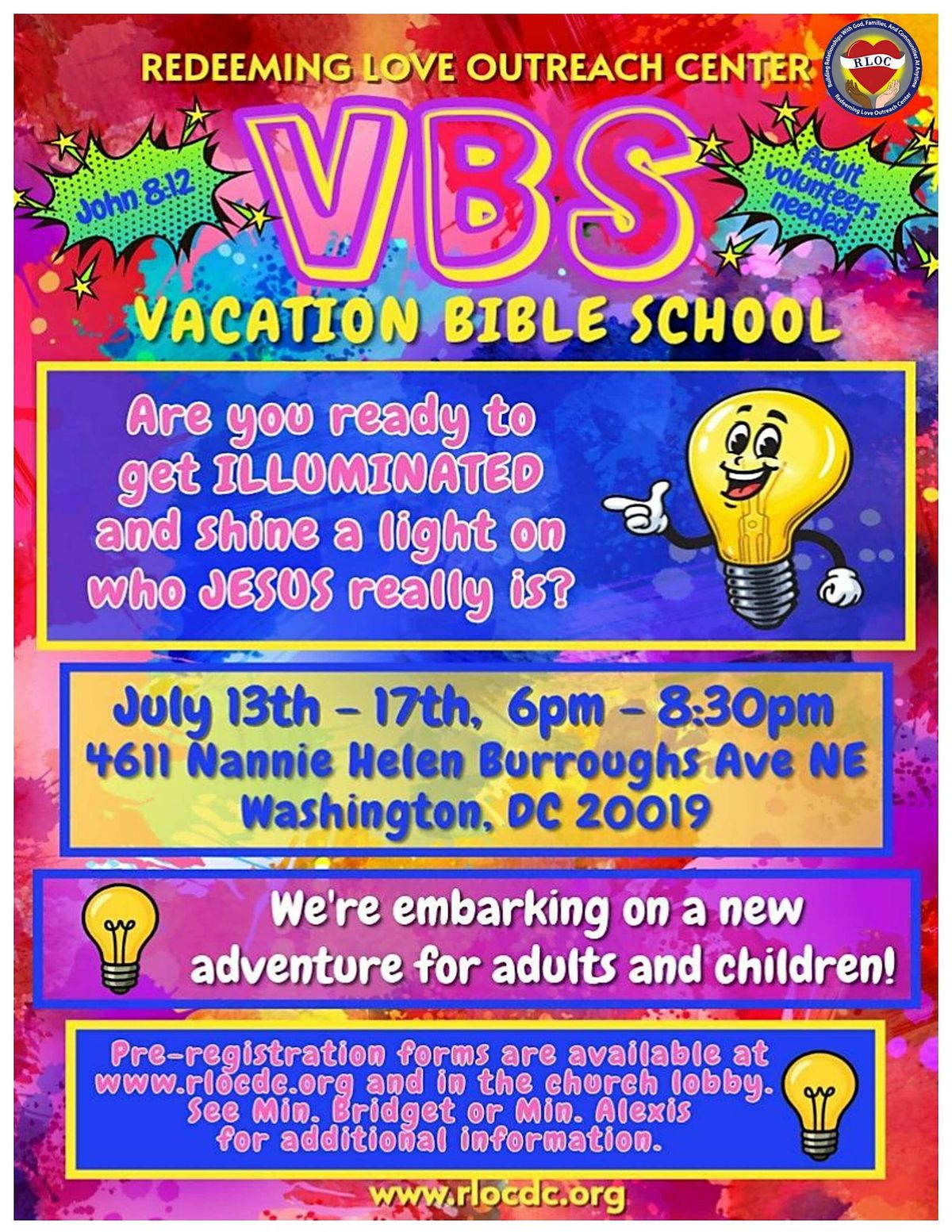Come hang out with us at 4611 Nannie Helen Burroughs Ave NE for a fun and inspiring evening. We’ll dive into some cool Bible stories, enjoy games, and make new friends. It’s all happening on July 13, 2026 at 6:00 PM (Eastern Daylight Time) through July 17, 2026. Don’t miss out on this awesome chance to learn and have a blast in a relaxed, friendly setting. See you there! All participants must register here. If you have questions please reach out to [email protected]