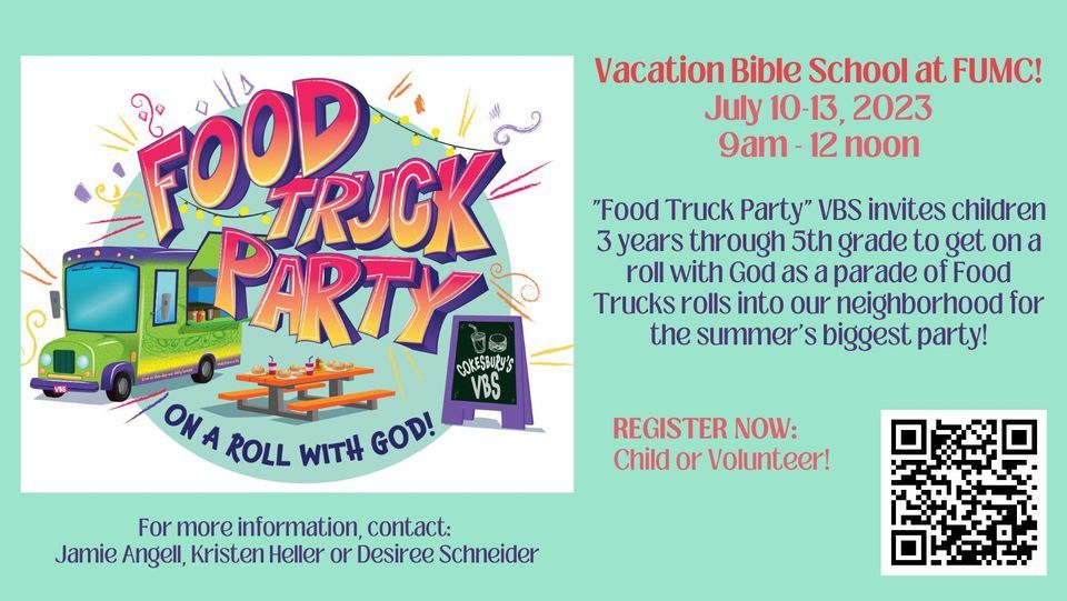 "Food Truck Party" ? Vacation Bible School will roll into FUMC for the summer's ☀️ biggest party ? July 10-13 from 9 am to 12 noon. We invite all children 3 years through 5th grade to join us as we get on a roll with God! ?REGISTER NOW here: https://fumcvictoria.mycokesburyvbs.com