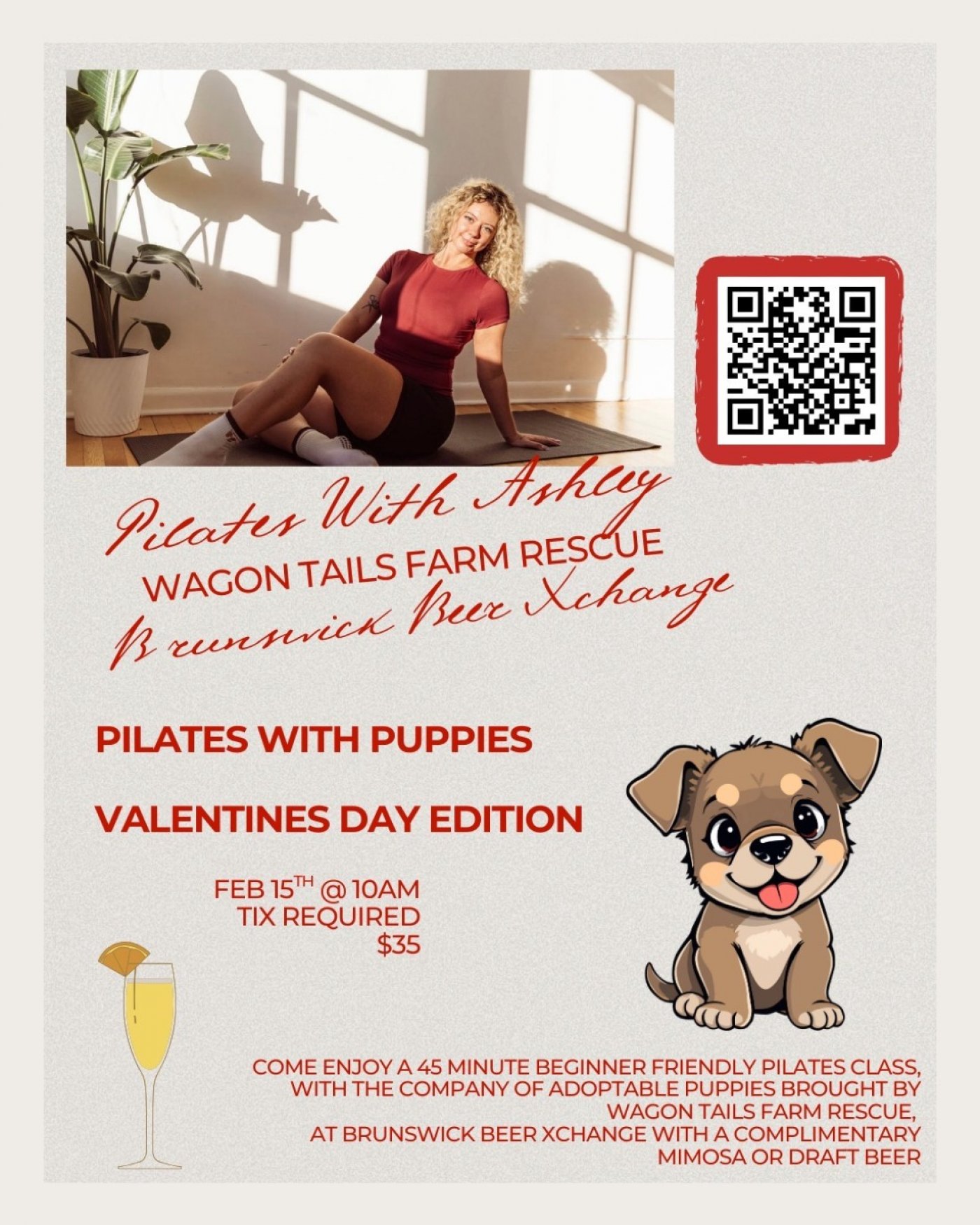 Come out and enjoy a 45min session of beginner friendly Pilates with our audience Ashley! Included in your $35 ticket price is a complimentary mimosa or draft beer and allllll the puppy snuggles you can handle.