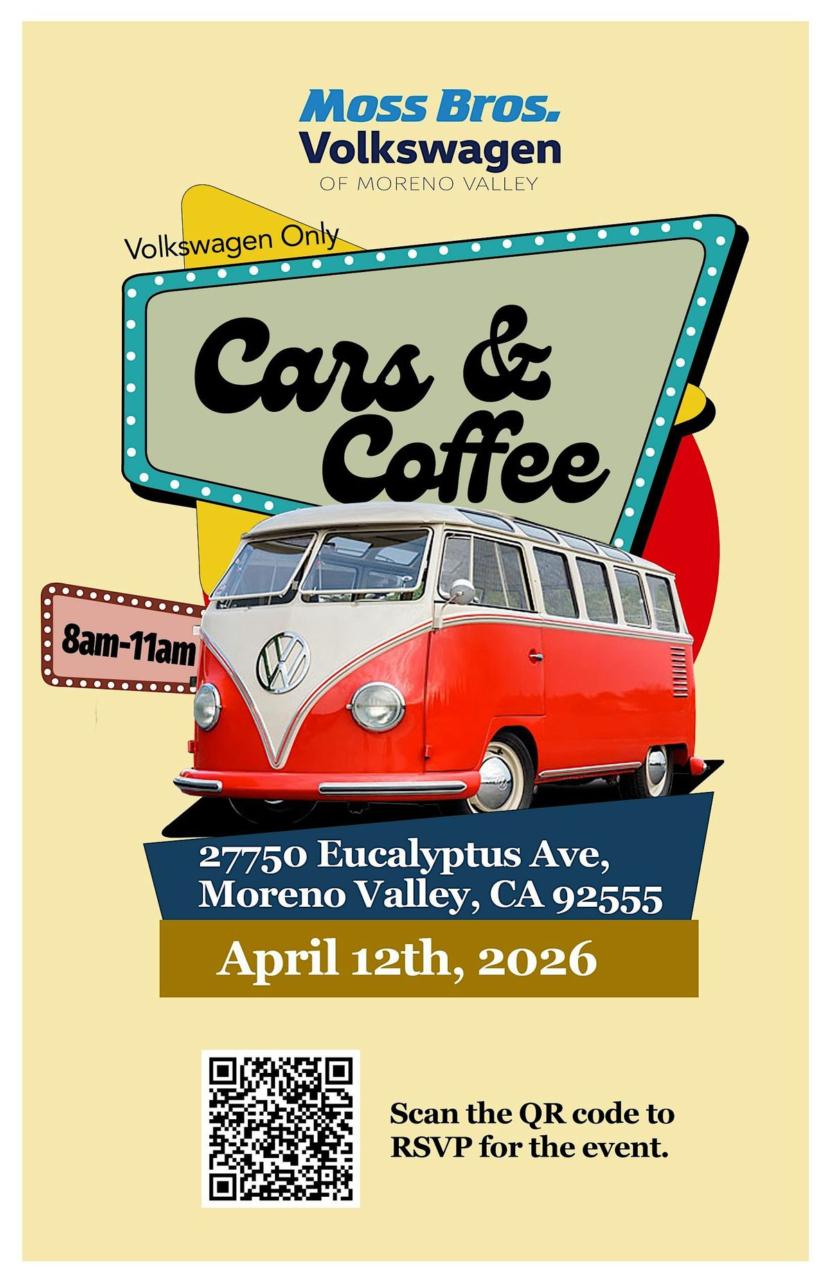 Join us for our VW Cars & Brew at Moss Bros Volkswagen in Moreno Valley! March 29, 8–11 AM. First 50 guests get FREE coffee!