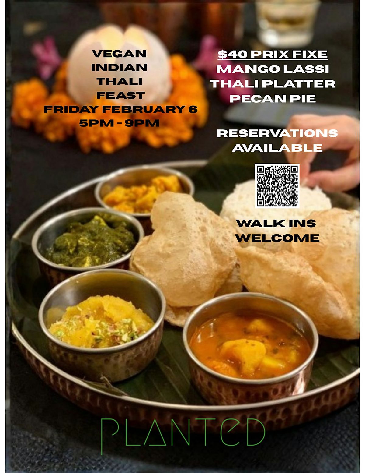 Take the family out for a warm, flavorful Indian-inspired dinner at Planted Café. Our $40 prix fixe menu features a festive Thali with vibrant, authentic, plant-based Indian dishes, a creamy vegan mango lassi, and a house-made vegan pecan pie for dessert.