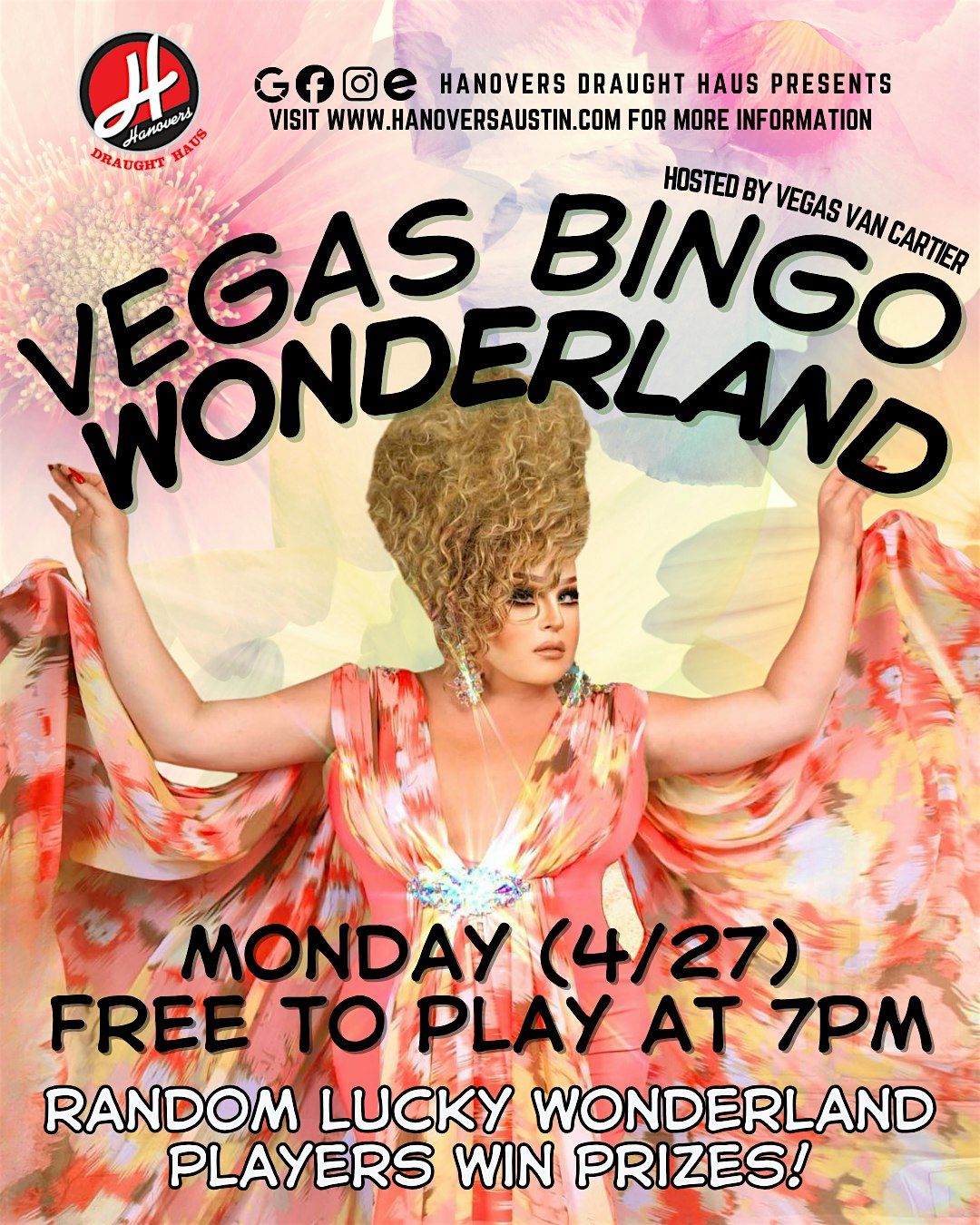 Welcome to Hanovers Drag Bingo Night! We are proud to co-host alongside Ms. Vegas Van Cartier to bring you a safe & pfun LGBTQIA+ event!