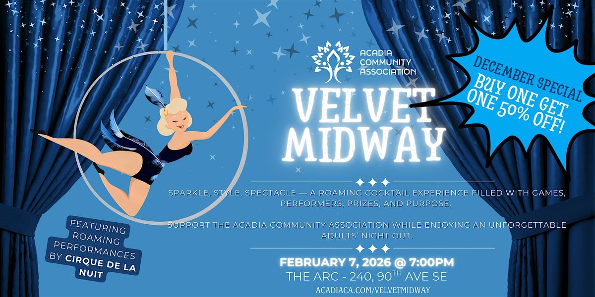 Welcome to Velvet Midway, Calgary’s newest adults-only winter gala — a dazzling blend of classic carnival elegance and cirque-style wonder. For one unforgettable night, the ARC is transformed into a shimmering blue-and-white midway draped in soft lights, flowing fabrics, and glimmering winter details.