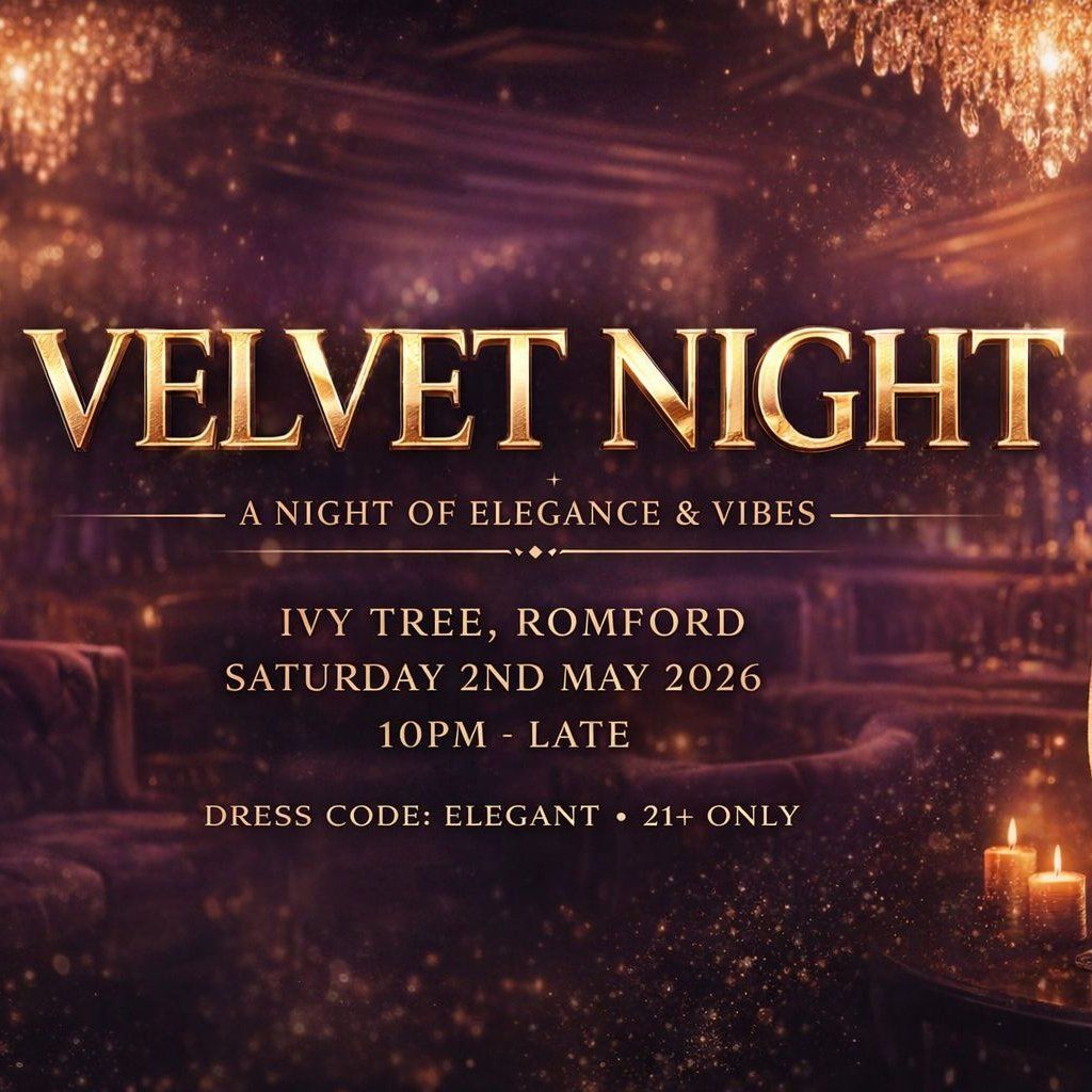 VELVET NIGHT brings elite vibes to Romford with 90s, 00s hip hop, RnB, Afrobeats, Amapiano and more. Dress elegant. Limited tickets. 21+ only.