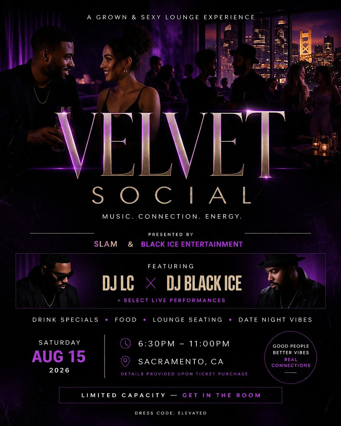 Step into Velvet Social—an elevated evening designed for those who appreciate intentional vibes, great music, and even better company.