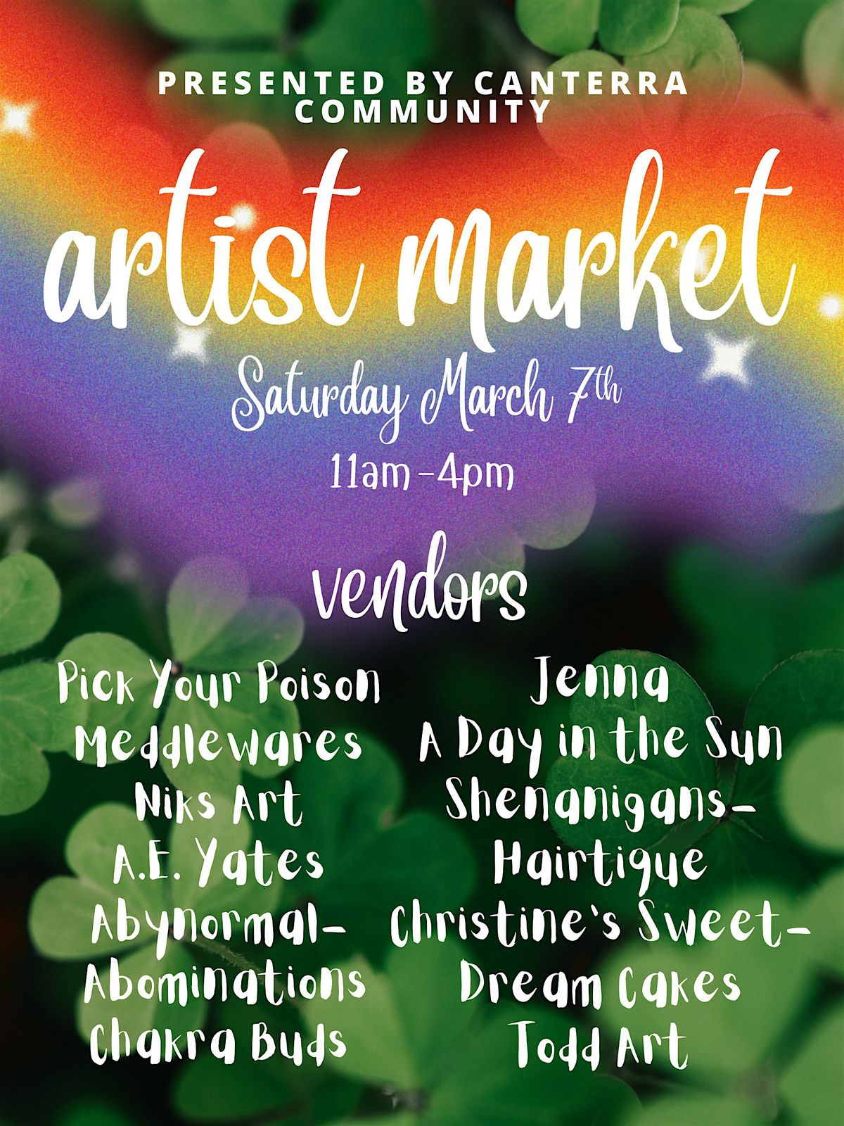 Looking for a fun day out? Swing by the Vendor Market at Canterra! This in-person event brings together awesome local vendors showcasing unique goodies, artistic creations, and delicious food options. Whether you're hunting for cool gifts, tasty treats, or just want to soak up some good vibes, this market has you covered. Come explore, chat with friendly sellers, and enjoy a chill day of shopping and community fun!