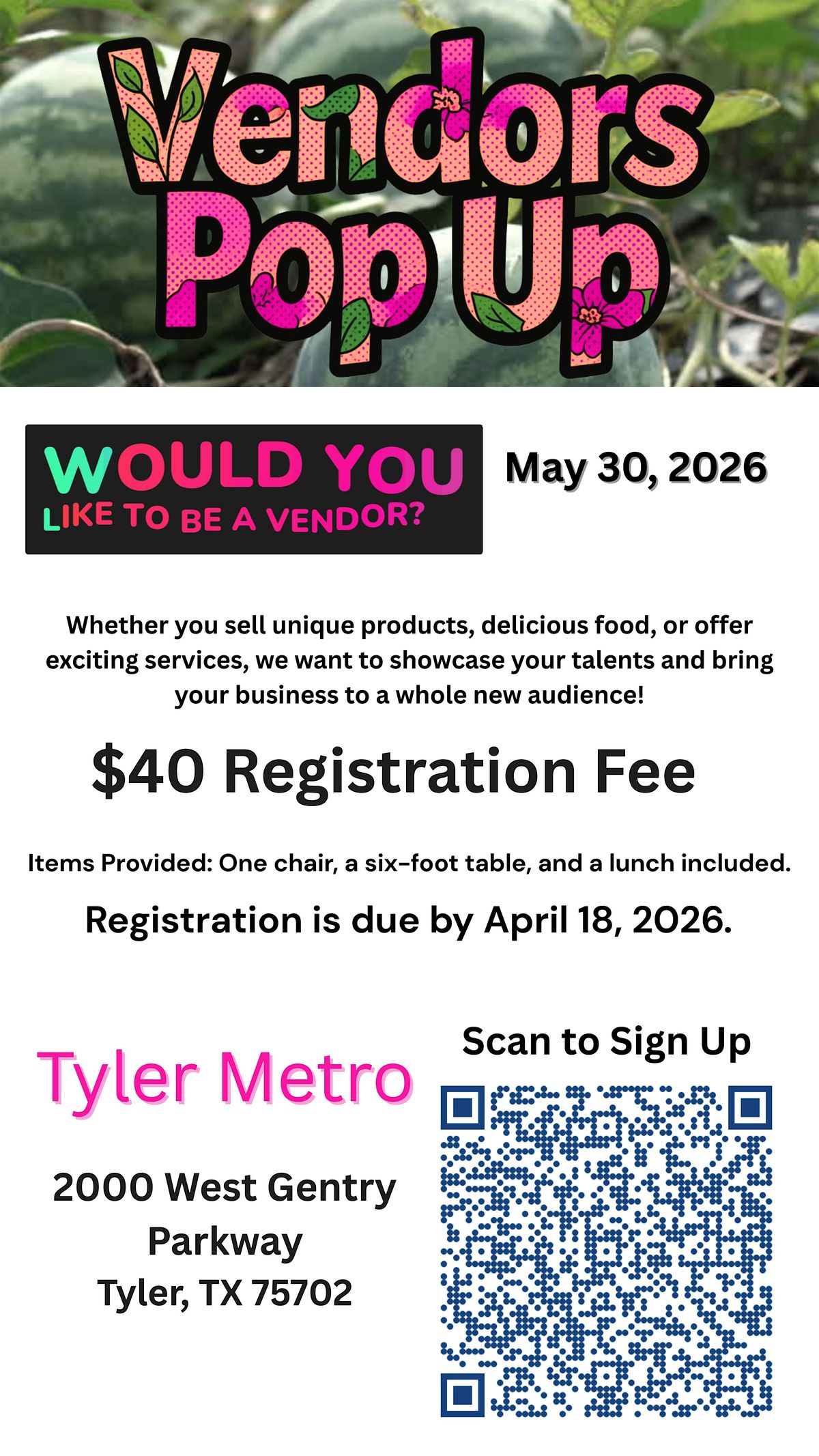 Hey there! We're looking for awesome vendors to join our pop-up event at the Tyler Metropolitan Chamber-Commerce. It's happening on May 30, 2026 at 11:00 AM (Central Time). If you want to showcase your products and connect with the local community, this is your chance! Don't miss out on a fun and casual day of sales and networking. Come be part of something great!