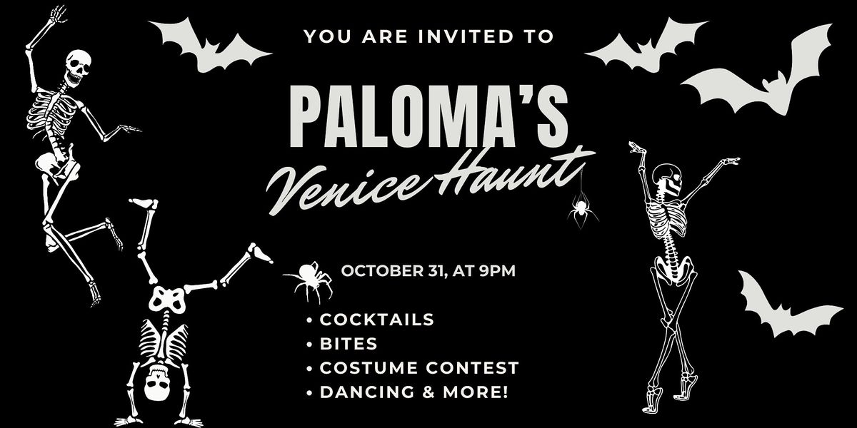 Step into the shadows and celebrate Halloween with us at Paloma Venice. Starting at 9:00pm, the night comes alive with music, a spooky-chic photo booth, carnival-style games, and plenty of festive treats. Sip cocktails, strike a pose, and let the eerie energy of Venice carry you late into the night. This event is 21+ only. Each guest will receive one complimentary drink ticket upon entry. Don’t forget to dress to impress, our costume contest winner will take home a $200 Paloma gift card. Costumes encouraged, mystery and mischief guaranteed.