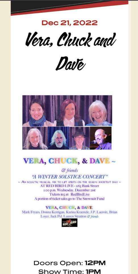 “Vera, Chuck, and Dave” is a new group of seven musicians led by Lauren Stratton who will present a mix of familiar and original music with lots of vocal harmonies - especially featuring the three lead women vocalists. A few will reflect our Winter Solstice theme, and we will likely invite the audience to sing along on one or two! A large part of the proceeds will go to the Snowsuit Fund!