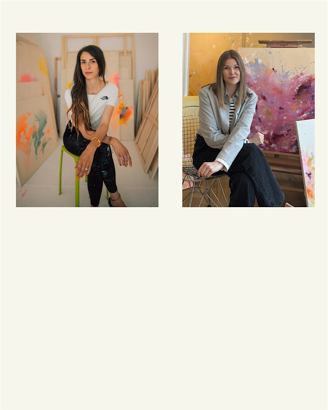 Marikas Arbeiten stehen im Zentrum der Ausstellung und treten in einen Dialog mit dem Raum sowie mit ausgewählten Arbeiten von Soraya. Wir freuen uns darauf, diesen besonderen Abend gemeinsam mit euch zu erleben.