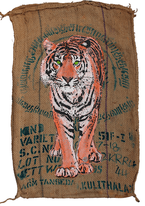 La galerie Artistik Rezo accueille Mosko pour une nouvelle exposition personnelle du 29 janvier au 28 février 2026. L’artiste nous invite au voyage à travers des œuvres peintes sur des sacs en jute, glanés au cours de ses déplacements en Inde et ailleurs.