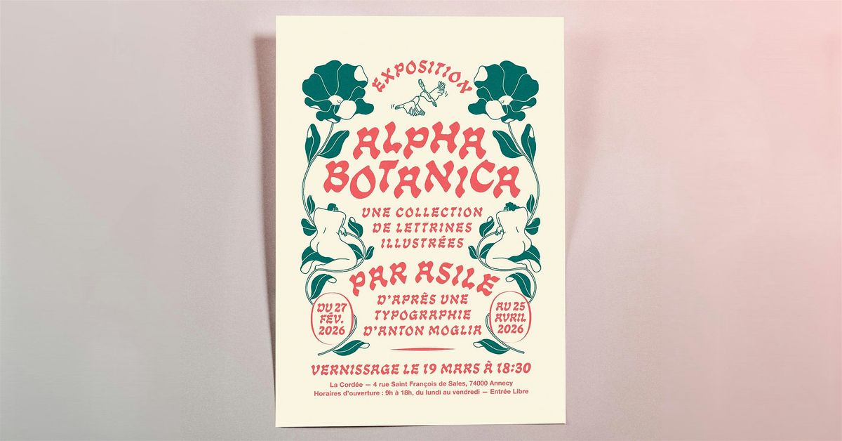 Le printemps arrive… et avec lui l’exposition Alphabotanica réalisée par Asile, illustratrice, et Anton Moglia, calligraphe. Cette exposition mêle calligraphie, typographie et illustration dans un dialogue délicat entre lettres et végétal. Pour l’occasion, une série de 26 lettrines illustrées ont été imaginées pour l’ensemble de l’exposition. Si vous êtes à Annecy ou de passage, nous serions très heureux·ses de vous retrouver au vernissage le jeudi 19 mars à 18h30 à La Cordée à Annecy.
