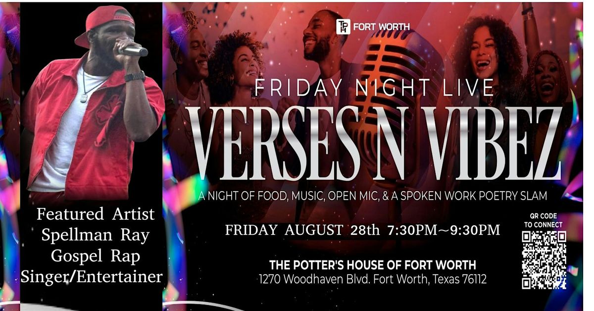 VERSES & VIBES On Friday, August 28th, the Potters House in Fort Worth will host the second annual Verses and Vibes Gospel Spoken Word Competition, organized and presented by Mike Guinn Entertainment in collaboration with the Pat's House Fort Worth Friday Night Live series. Featuring Spellman Ray (Gospel Rap Artists) There will be food, Performers, an open mic session, and live music. 7-9 PM and it’s free to the public..