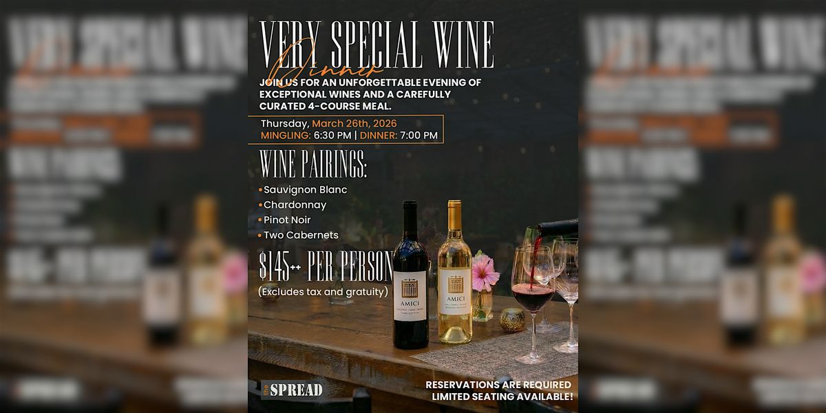 Experience a night of indulgence at The Spread’s Very Special Wine Dinner on Thursday, March 26th, 2026. This exclusive evening features a curated 4-course meal paired with exceptional wines, including a Sauvignon Blanc, Chardonnay, Pinot Noir, and two Cabernet selections. Guests will mingle starting at 6:30 PM, with the seated dinner beginning promptly at 7:00 PM.