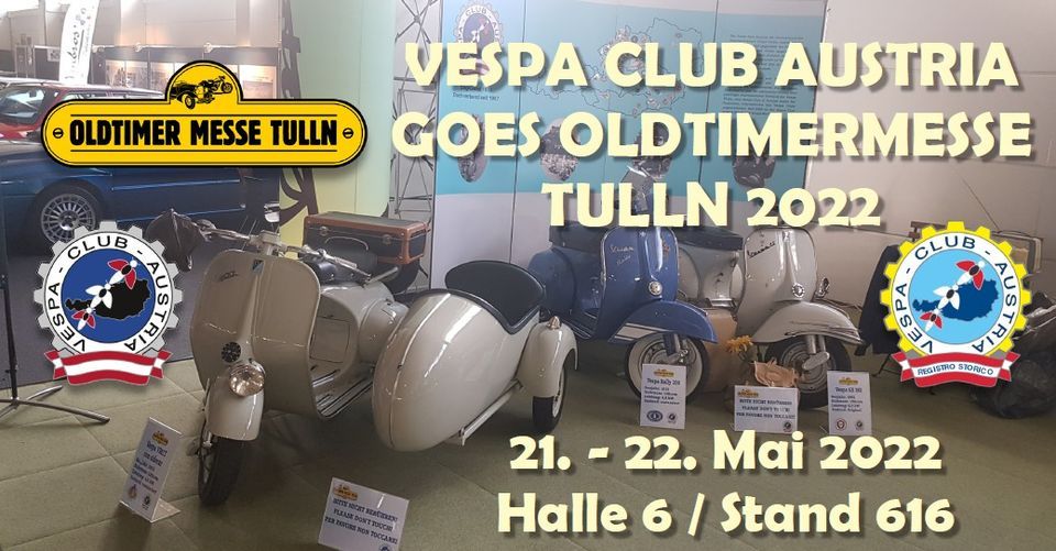 Nach 2 Jahren pandemiebedingter Pause zeigt der Vespa Club Austria heuer wieder auf der Oldtimermesse in Tulln eine Auswahl an historischen Fahrzeugen unserer Clubmitglieder. Wir freuen uns auf Euer kommen und sehen uns in der Halle 6 / Stand 616!