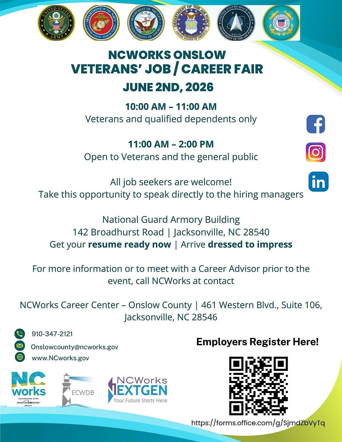 For more information or to meet with a Career Advisor prior to the event, call the Onslow NCWorks office at 910-347-2121.