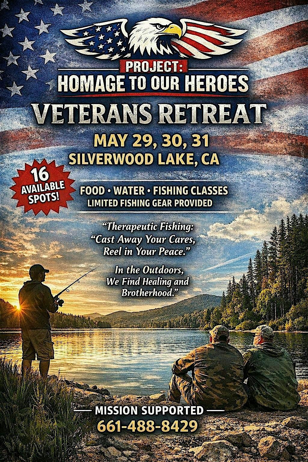 This retreat is designed to provide a peaceful, therapeutic outdoor experience focused on camaraderie, fishing, healing, and reconnecting with nature.