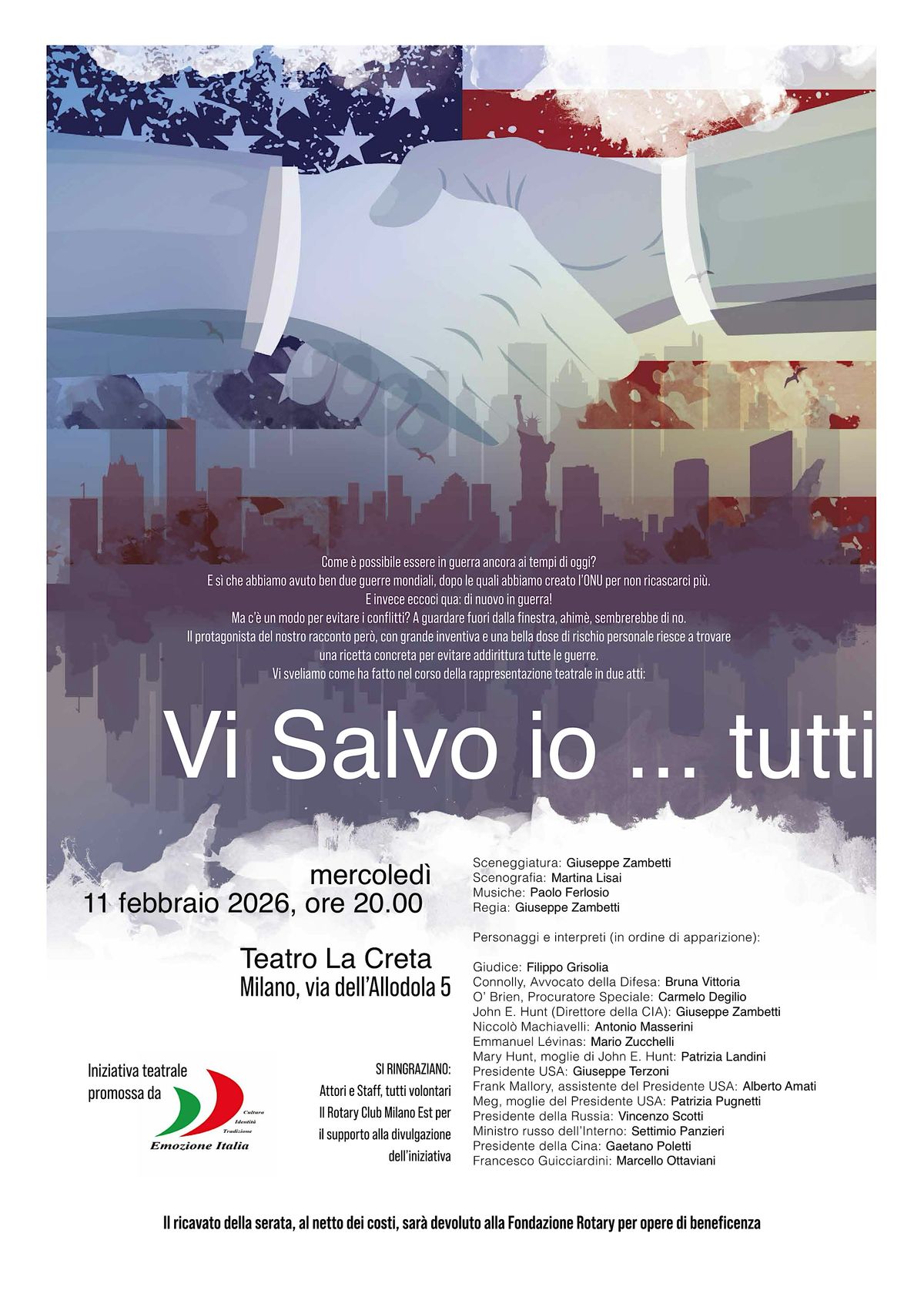 Come è possibile essere in guerra ancora ai tempi di oggi? E sì che abbiamo avuto ben due guerre mondiali, dopo le quali abbiamo creato l’ONU per non ricascarci più. E invece eccoci qua: di nuovo in guerra! Ma c’è un modo per evitare i conflitti? A guardare fuori dalla finestra, ahimè, sembrerebbe di no. Il protagonista del nostro racconto però, con grande inventiva e una bella dose di rischio personale riesce a trovare una ricetta concreta per evitare addirittura tutte le guerre. Vi sveliamo come ha fatto nel corso della rappresentazione teatrale in due atti: Vi Salvo io ... tutti
