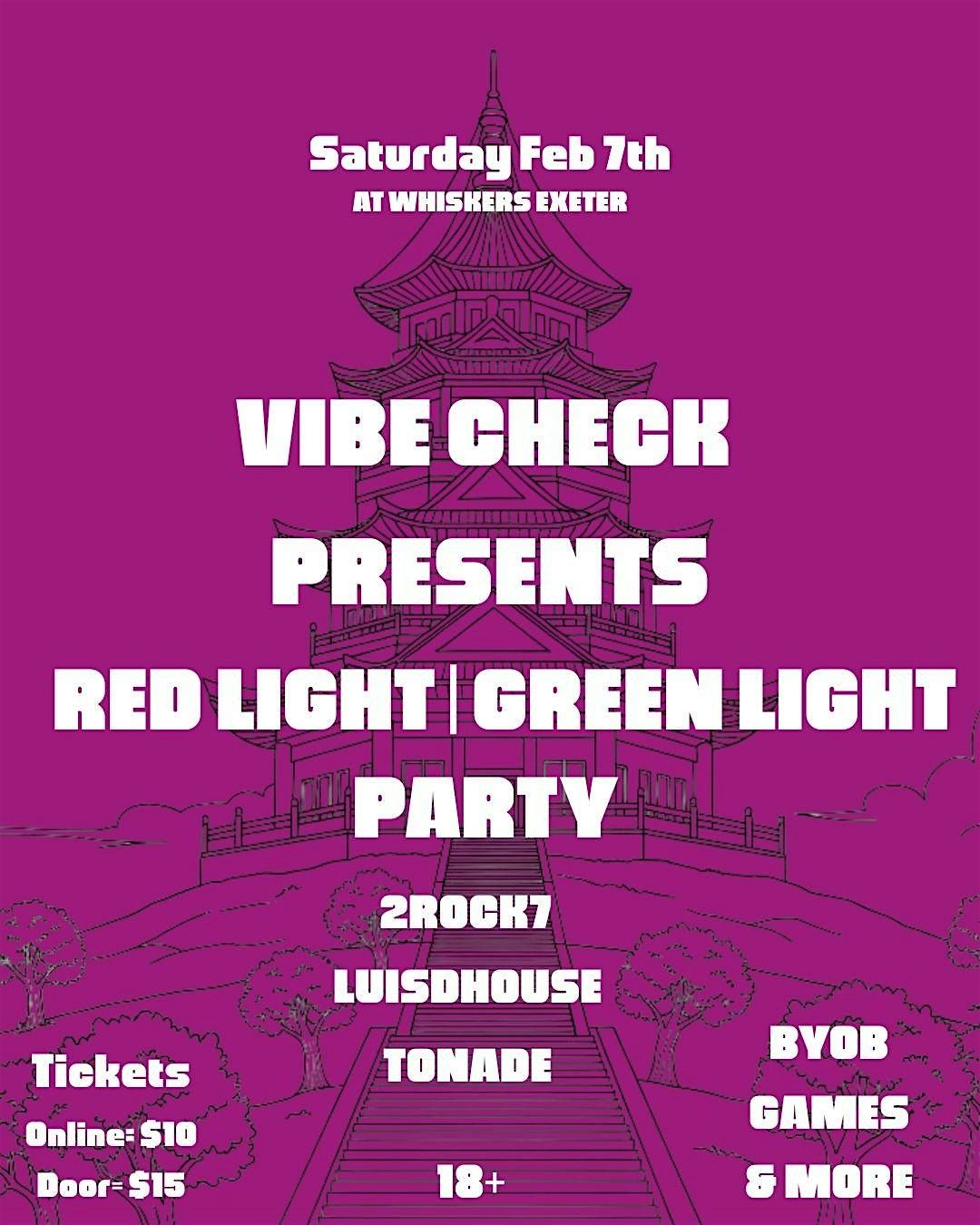 For our first Vibe Check party of the year, we are hosting a Red Light | Green Light themed event. As guests arrive, they will receive LED wristbands with specific meanings: Green if you are single, Red if you are taken, and Blue if you are looking to network.