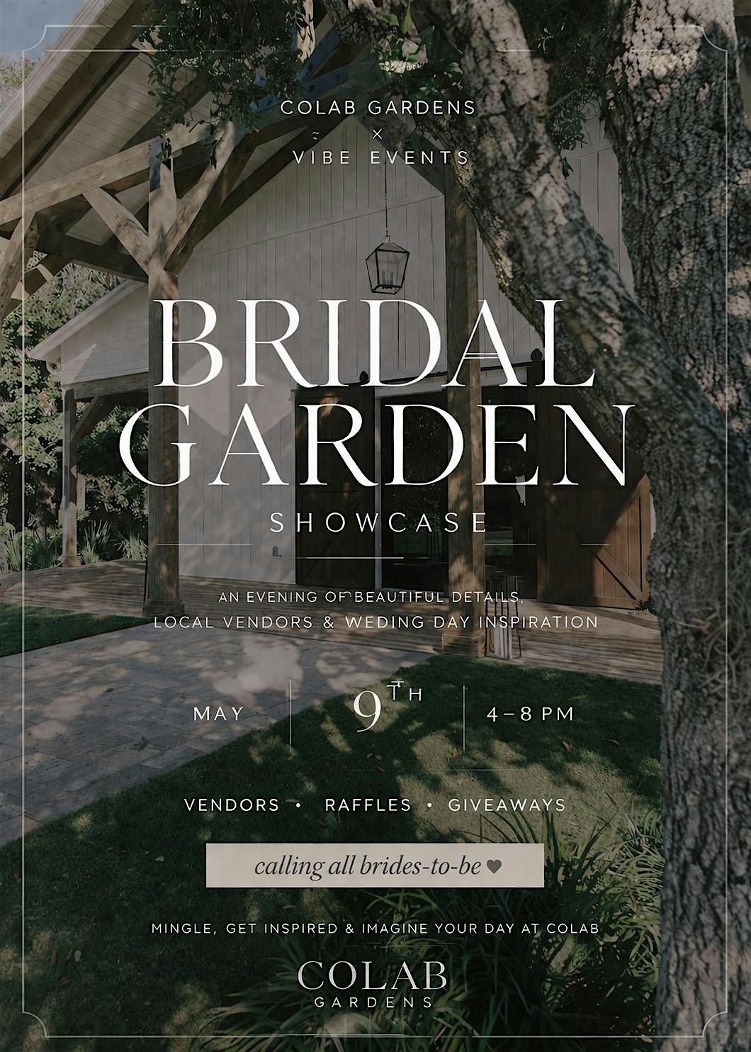 Join Vibe Events on May 9th from 4β8 PM at CoLab Gardens for the ultimate Bridal Showcase experience ππΏ Think a dreamy night filled with some of the best local wedding vendors including photographers, florists, planners, bridal boutiques, beauty pros, DJs, and more β all in one place!