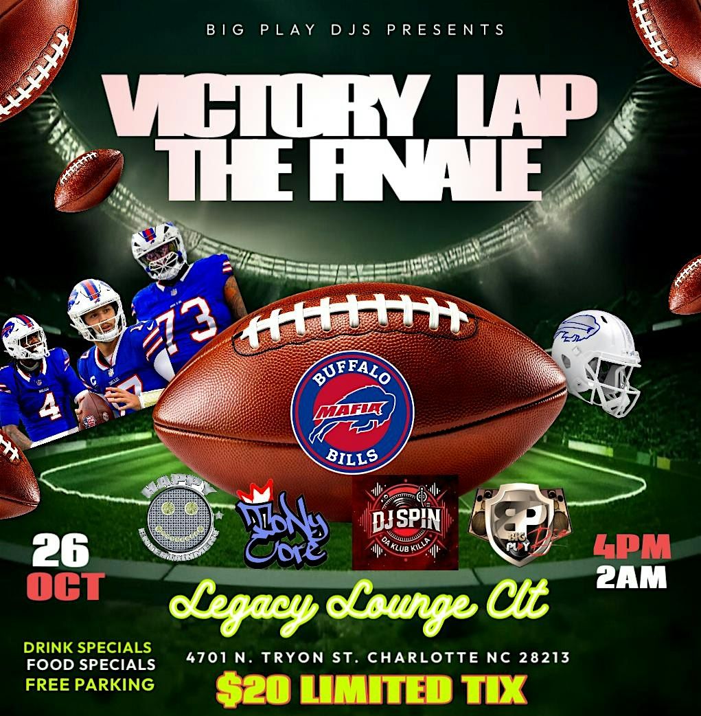 Welcome to VICTORY LAP THE FINALE BILLS MAFIA at Legacy Lounge Clt! Get ready for an epic night on October 26, 2025 at 4:00 PM (Eastern Time). Join us for the ultimate celebration with the Bills Mafia community. Let's come together to cheer on our team and create unforgettable memories. Don't miss out on this exciting event at Legacy Lounge Clt!