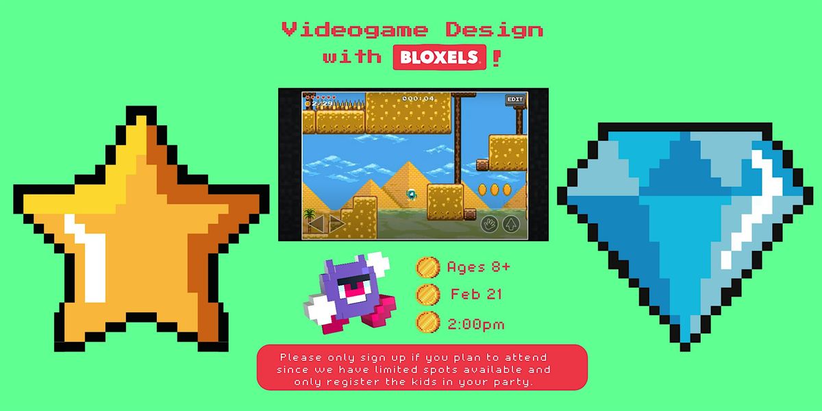 Children, ages 8 and up, will have fun designing videogames with Bloxels! Materials will be provided. Please only register if you know that you can attend. Please only register the kids in your party.