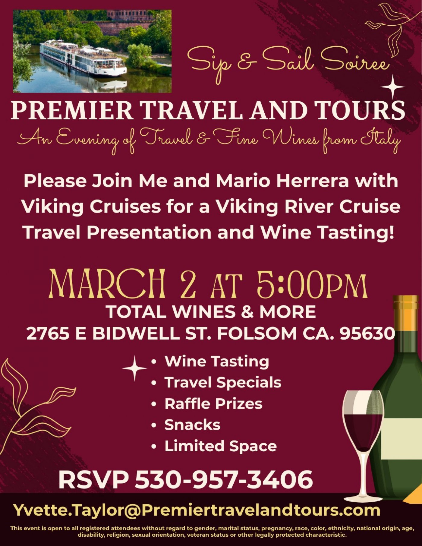 Embark on an extraordinary journey with PREMIER TRAVEL AND TOURS at our Viking Cruise Presentation and Wine Tasting event! Join us on March 2, 2026, at Total Wine & More in Folsom, CA for an unforgettable experience.
